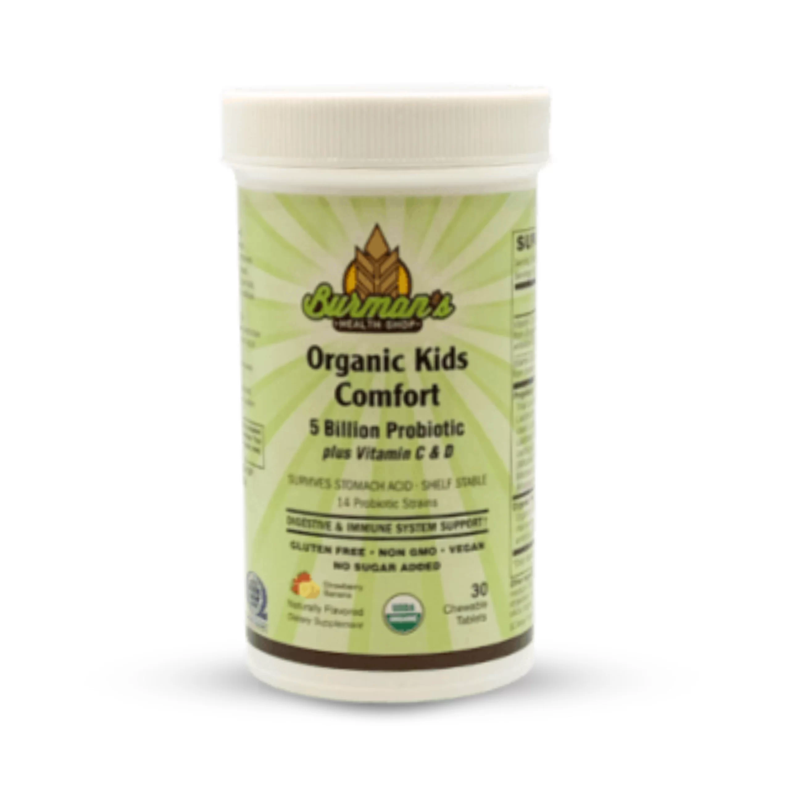 A Certified USDA Organic, Non-GMO, delicious, chewable probiotic, with no added sugars or sweeteners, this probiotic blend contains 5 Billion CFUs using 14 probiotic strains
